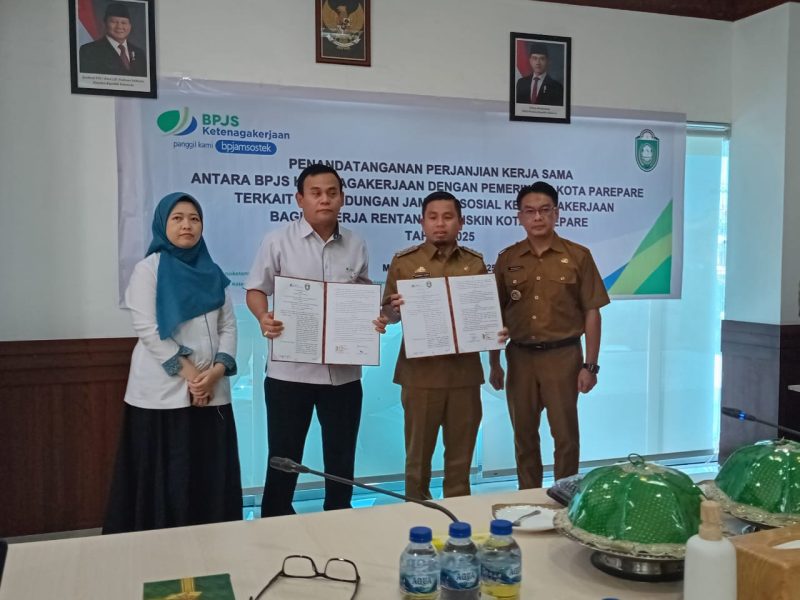 SUARADARING.COM, PAREPARE – BPJS Ketenagakerjaan bersama Pemerintah Kota Parepare, Sulawesi selatan, menggelar penandatanganan perjanjian kerjasama terkait perlindungan jaminan sosial ketenagakerjaan bagi pekerja rentan dan miskin di Kantor BPJS Ketenagakerjaan Jalan Urip Sumoharjo, Senin, 28 April 2025.