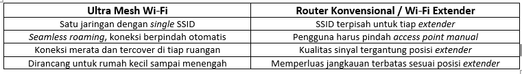 IndiHome Ultra Mesh Wi‑Fi dirancang sebagai solusi plug-and-play yang mudah digunakan, dengan satu jaringan Wi‑Fi terpusat (single SSID atau “access point”) yang memungkinkan pelanggan tetap otomatis terhubung secara nyaman saat berpindah dari satu ruangan ke ruangan lain tanpa perlu mengganti “Wi-Fi” secara manual (seamless roaming).